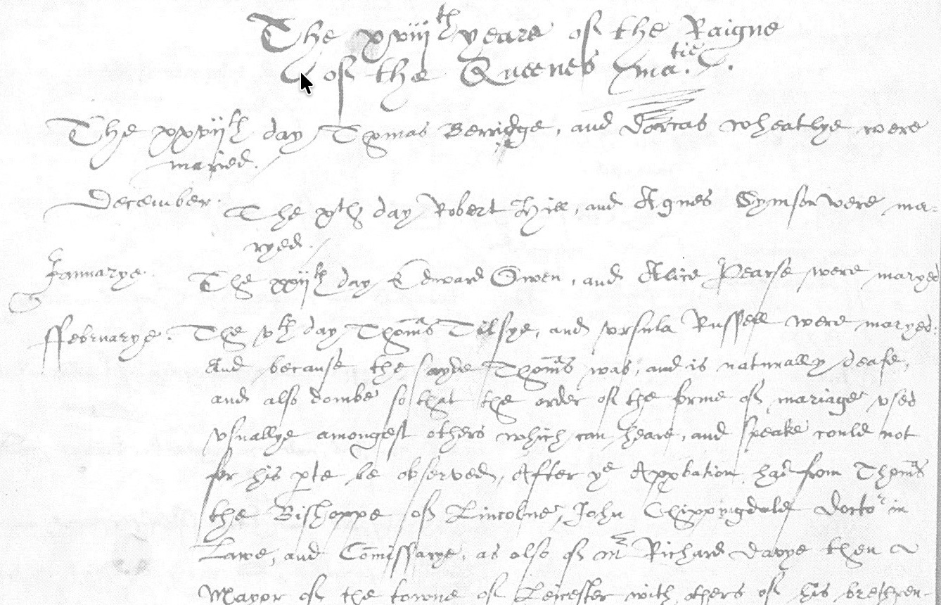 Church records show that the earliest documented use of sign language in this country was in a marriage ceremony between two people named Thomas Tilsye and Ursula Russel in St Martin’s Church (now Leicester Cathedral) on 6 February 1576.