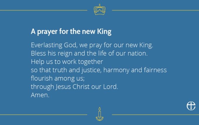 A Prayer for our new King, Charles III Everlasting God, we pray for our new King. Bless his reign and the life of our nation. Help us to work