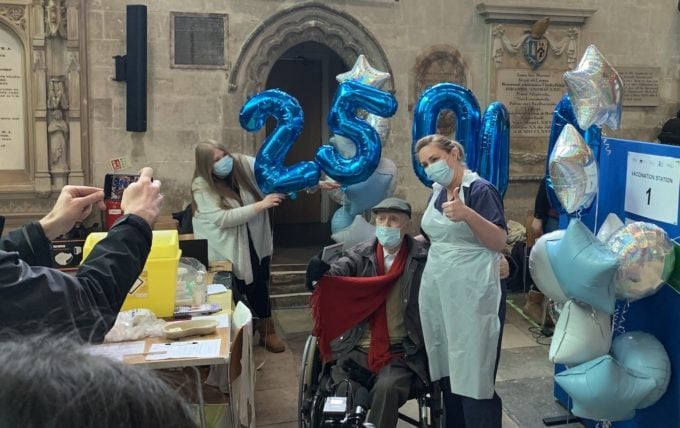 It’s a double whammy for Salisbury Cathedral who on Saturday celebrated the 25,000th patient receiving their Covid vaccination in the nave and