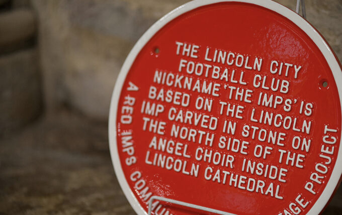 A red sign celebrating the origin of Lincoln City Football Club’s nickname – The Imps – has been unveiled at Lincoln Cathedral. Historic England